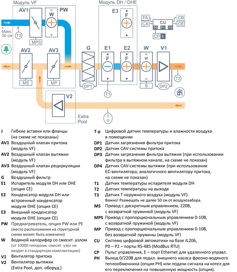 Вентиляционная установка Pool DH VF комплектуется вентилятором серии EC, системой автоматики JetLogic со всеми необходимыми датчиками, а также встроенным осушителем воздуха. В отличие от канальных осушителей эта модель может осушать воздух дозированной подачей сухого наружного воздуха (требуется дополнительная вытяжная установка). Серия Pool DH VF позволяет организовать полноценную систему вентиляции средней стоимости. В комплекте цветной сенсорный пульт управления TPD-283U-H.